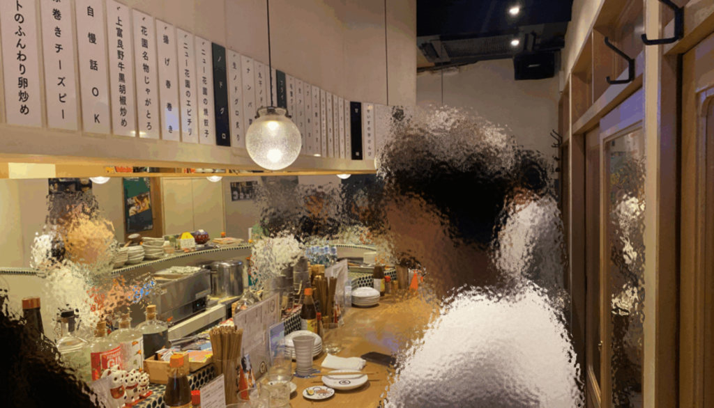 店内はカウンターのみとなっておりすべて立ち飲み席となっております。真ん中の調理場を中心にカウンターで囲うような形になっております。