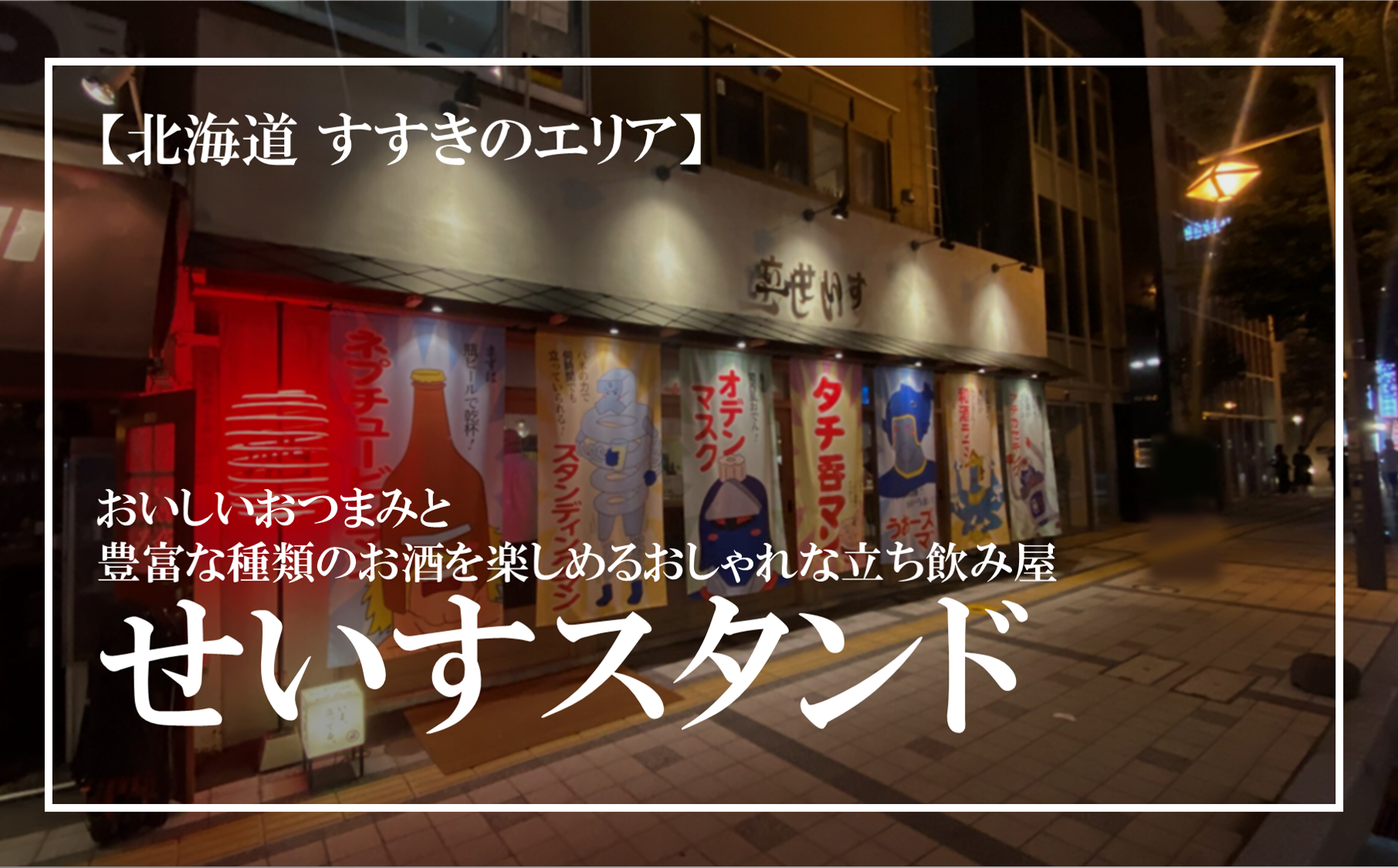 北海道すすきの駅の近くにある、おいしいおつまみと豊富な種類のお酒を楽しめるおしゃれな立ち飲み屋「せいすスタンド」。