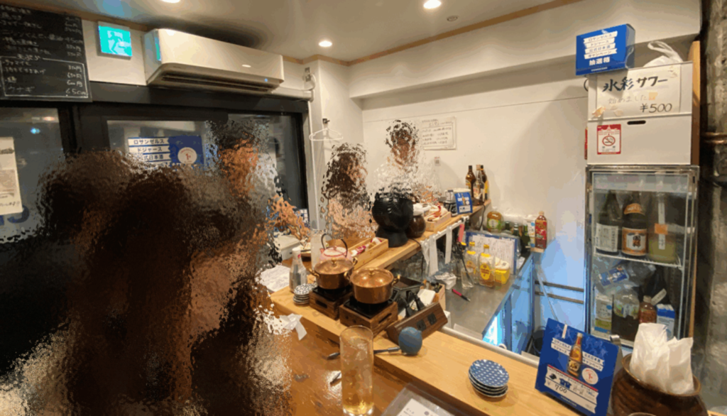 店内はカウンターのみとなっており、一番奥にはお通し代がかかりますが一部椅子席もありました。また、入口は路面沿いだけではなくこの奥にもあります。