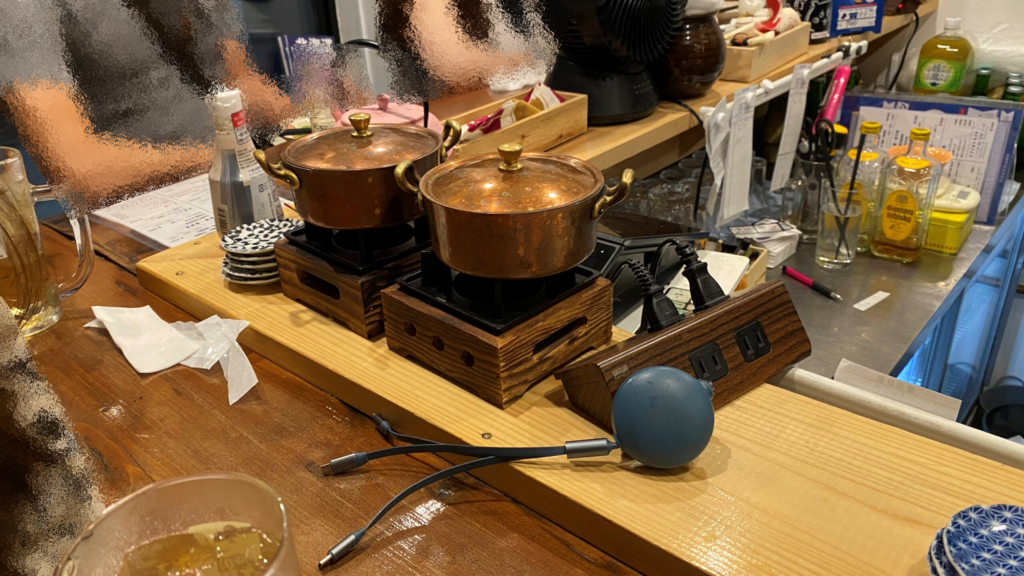 カウンターに上記写真のように電源タップと携帯の充電用ケーブルが設置されております。旅行で行った際など形態の充電なくなりがちなので、非常に助かるサービスとなっております。
