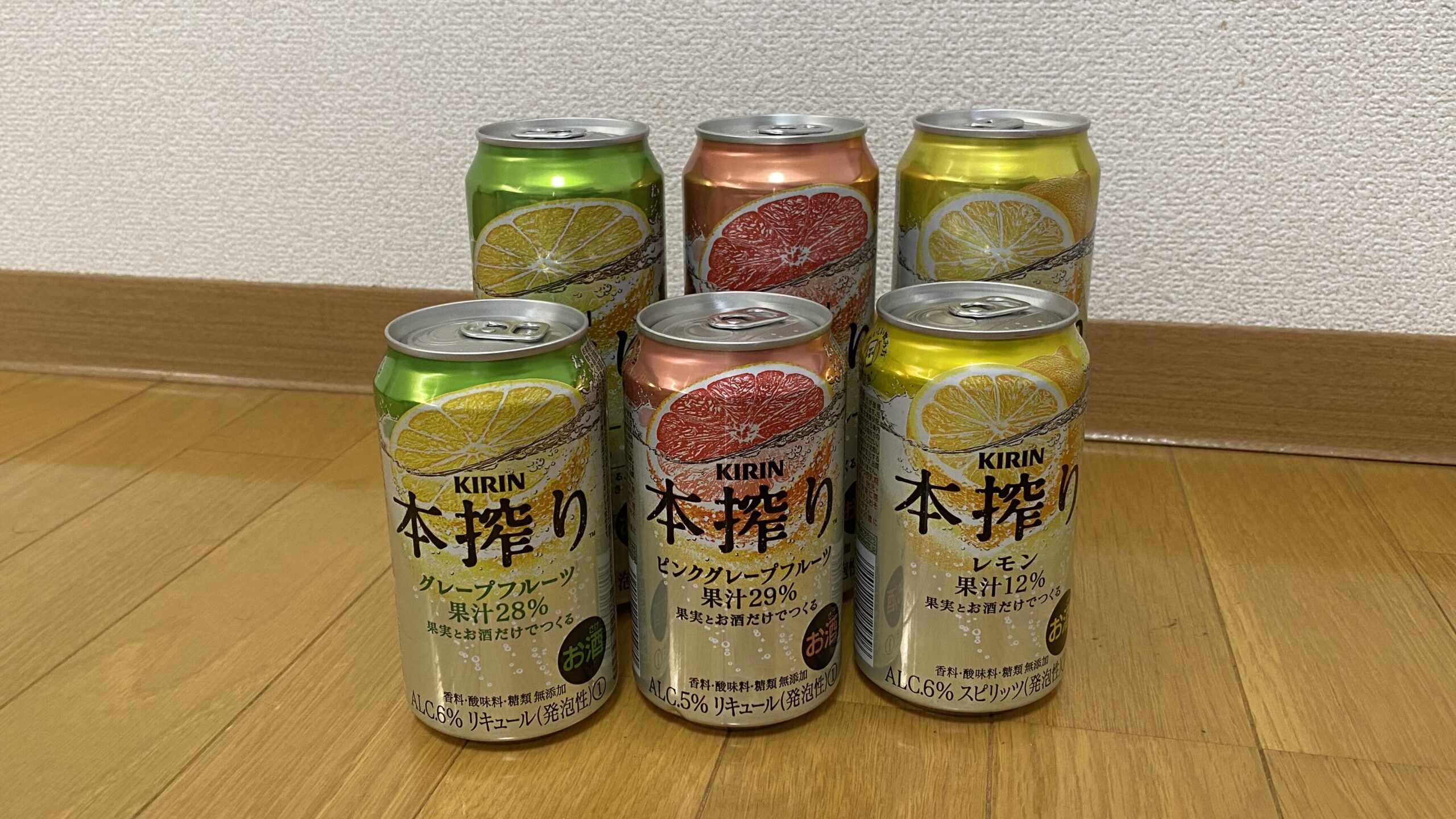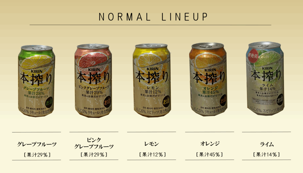 「本搾り」は上記画像の通り5種類の味が展開されており、それぞれ果汁の含有量が通常の缶チューハイに比べ非常に高いのが特徴です。