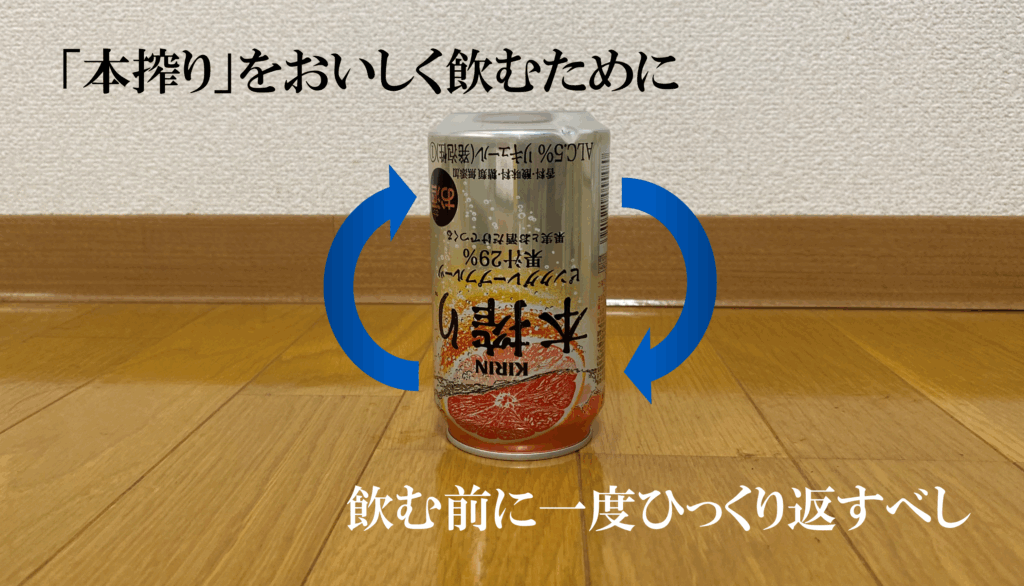 本搾りは果汁がたっぷり入っているため、飲む前に写真のように缶を逆さにして缶内の果汁を全体に回るようにすることで最大限本搾りを楽しめます。(KIRIN公式ページにてこの飲み方は推奨されております。)