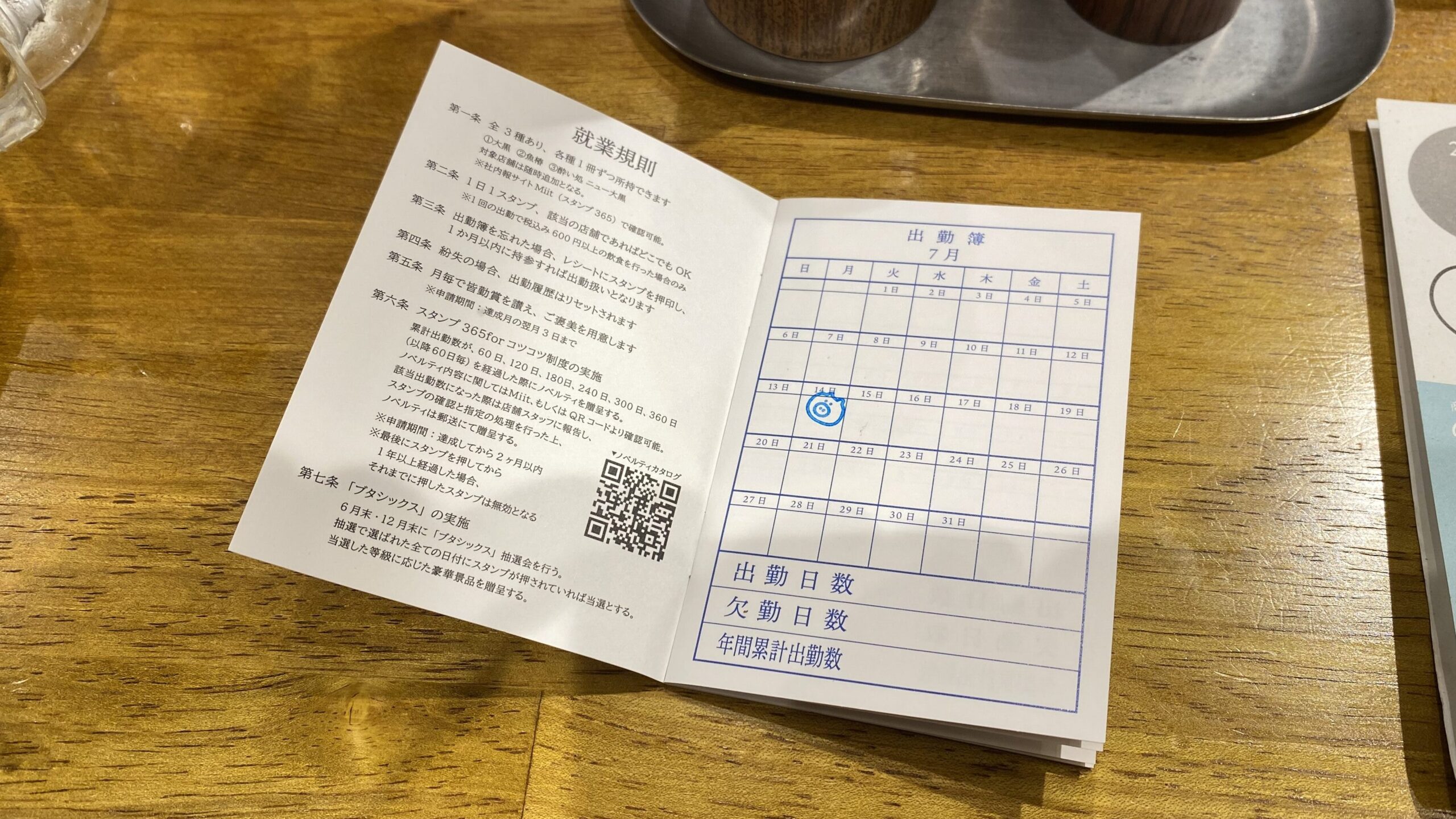 1来店1スタンプ推していただけます。小学校のころのラジオ体操のスタンプラリーを頼めるような感覚でついつい足を運びたくなってしまいます。中には就業規則なんかも記載されております。