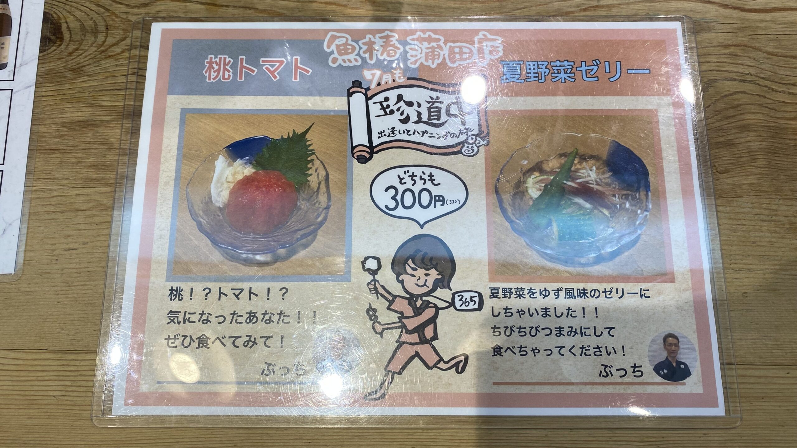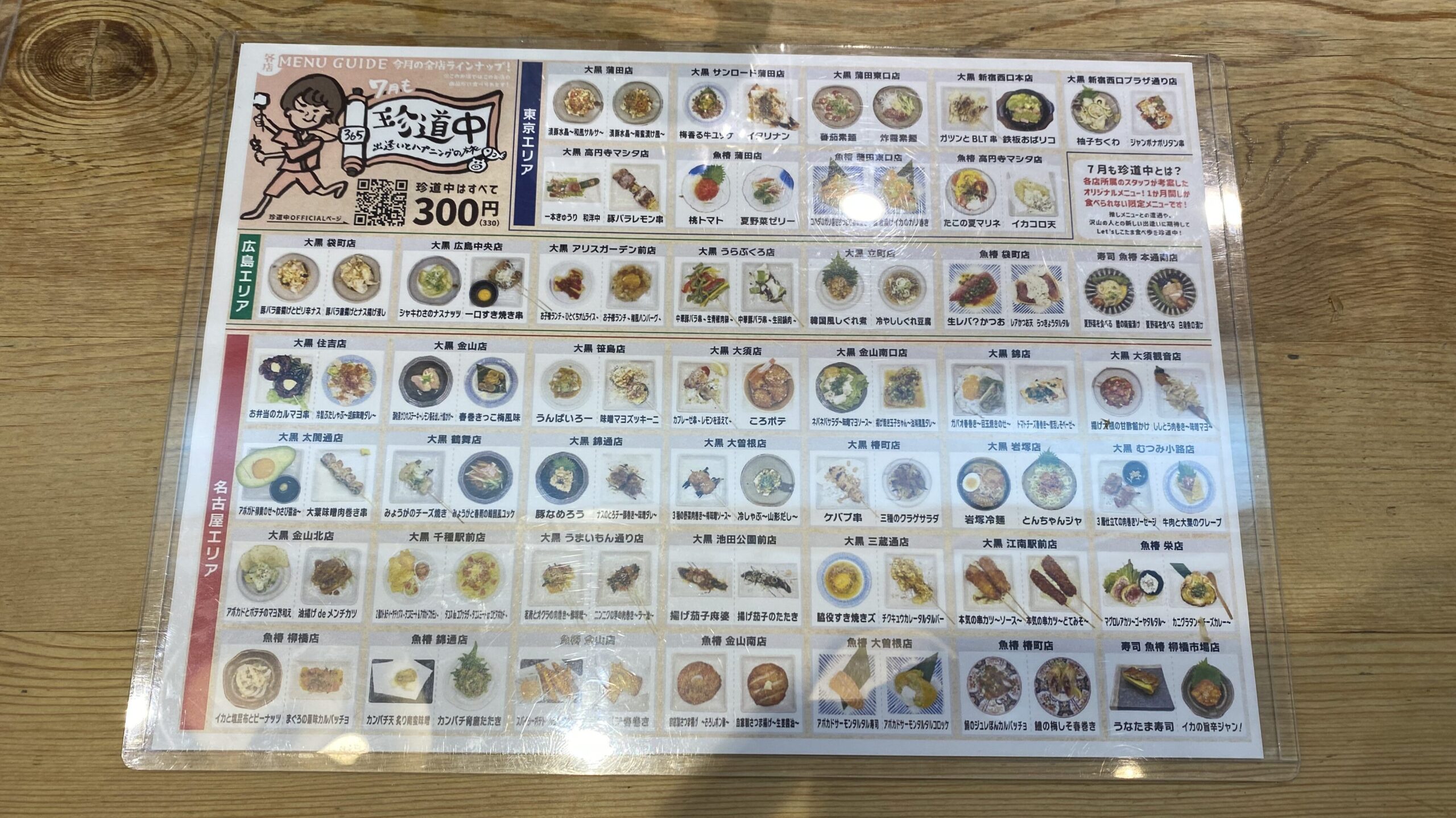 「珍道中 出会いとハプニングの旅」というメニュー表がありう店舗ごとで独自メニューを提供しております。チェーン店ながら店舗ごとで違うメニューがあるのは他の店舗も見かけた際は行ってしまいたくなります。