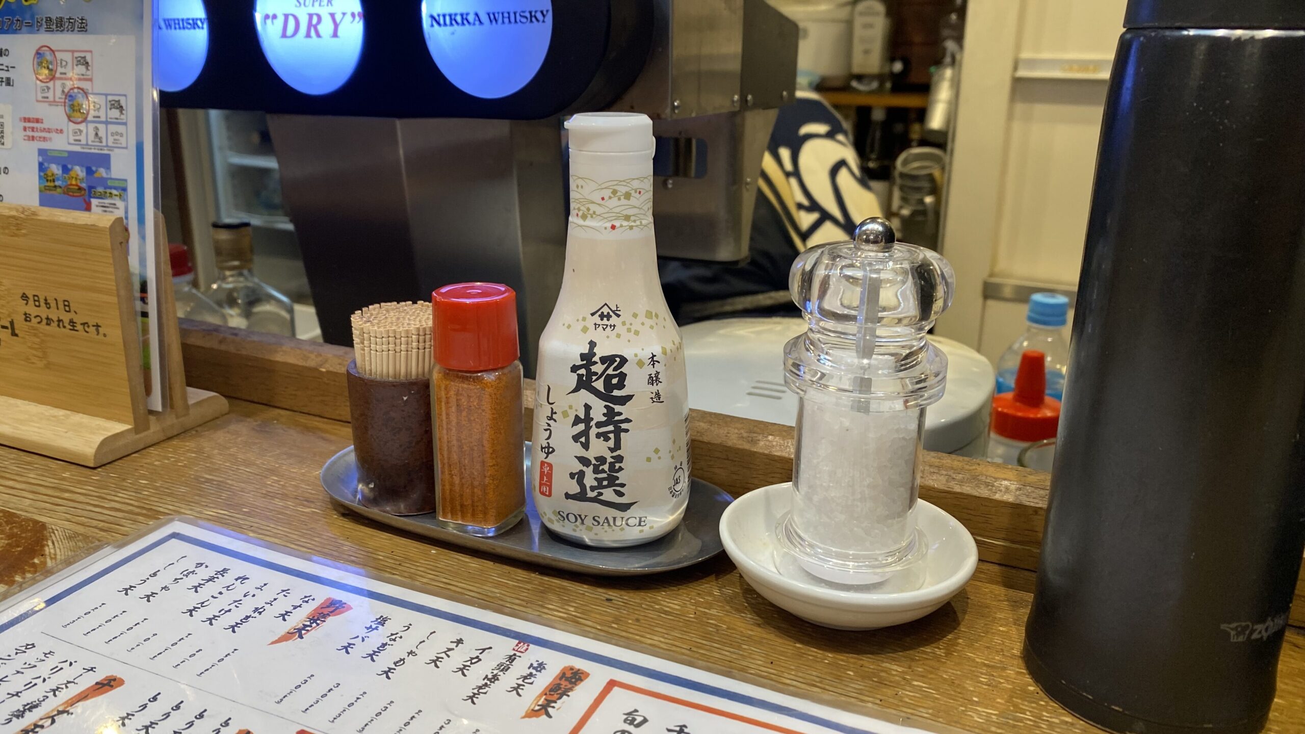 写真に写せておりませんが、こちらの店舗ではカウンター席の取り皿や、お箸、おしぼりがおかれているゾーンに充電ができるコンセントがついております。
