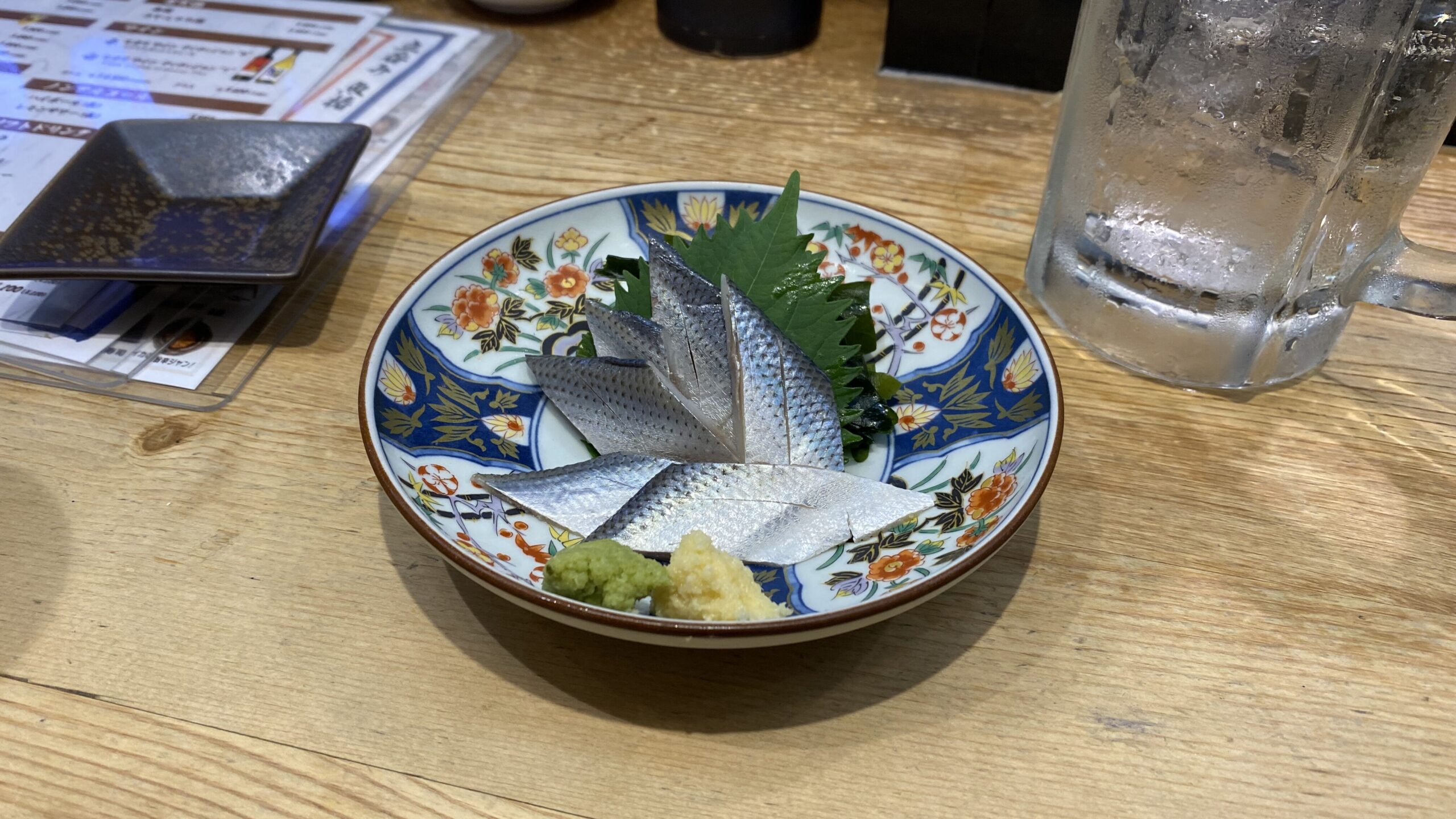 しょうがとわさびが準備されており、お好みで楽しめます。新鮮なお刺身でおすすめです。光物が食べたくこの日は王道のマグロではなく、こはだをいただきました。