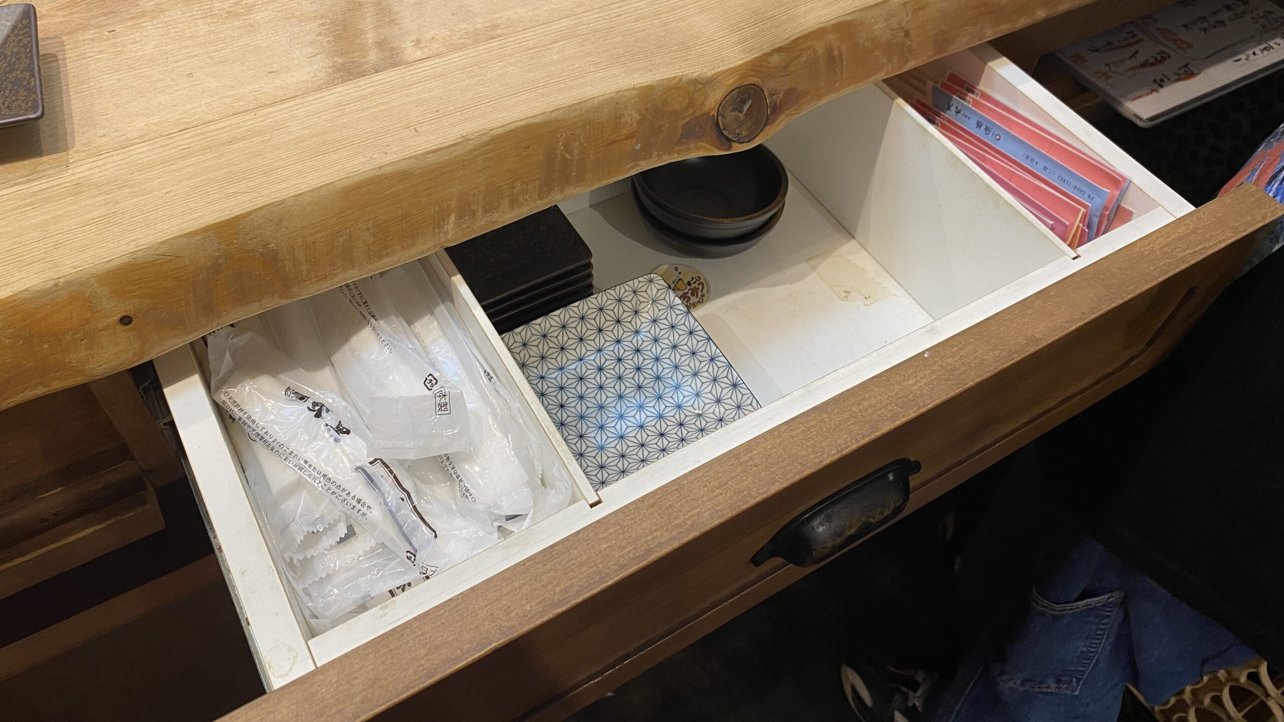 写真の通りカウンター下のスペースに取り皿やお箸、おしぼりがおかれております。このおかげでテーブルのスペースが広がるとともに、必要な際に店員さんにお声がけする必要もなくなります。