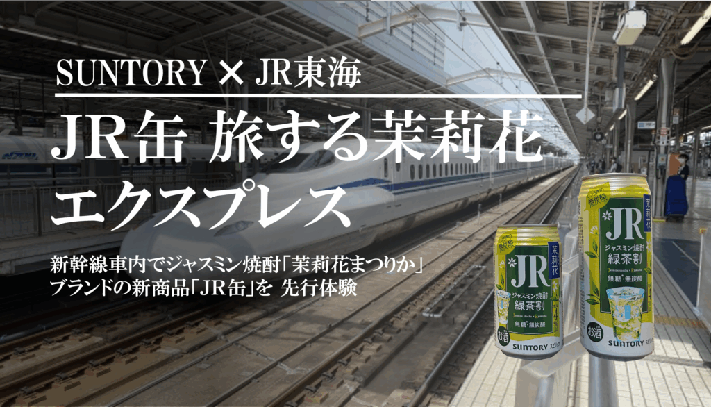 すでに終了済みですが、2025年10月25日に新幹線車内でジャスミン焼酎「茉莉花まつりか」ブランドの新商品「JR缶」を先行体験するイベントが行われておりました。