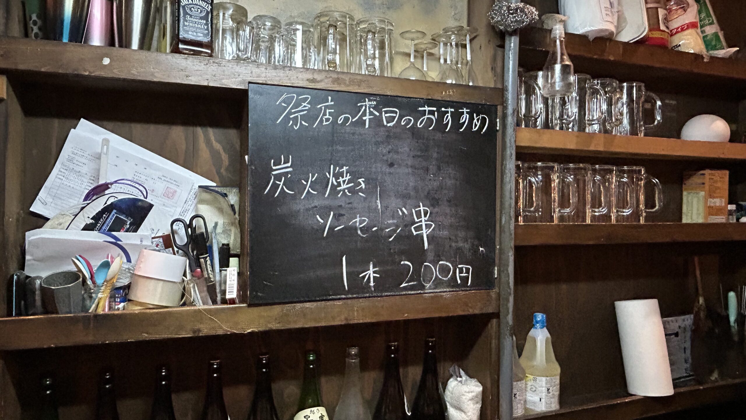 烏森口駅すぐの立ち飲み屋さん。こちらは本店ではなく祭り店です。とにかく常連さんが多く、周りの方との会話や店員さんとの会話がはずみます。おつまみもおいしいですし、お酒の提供も早くおすすめです。