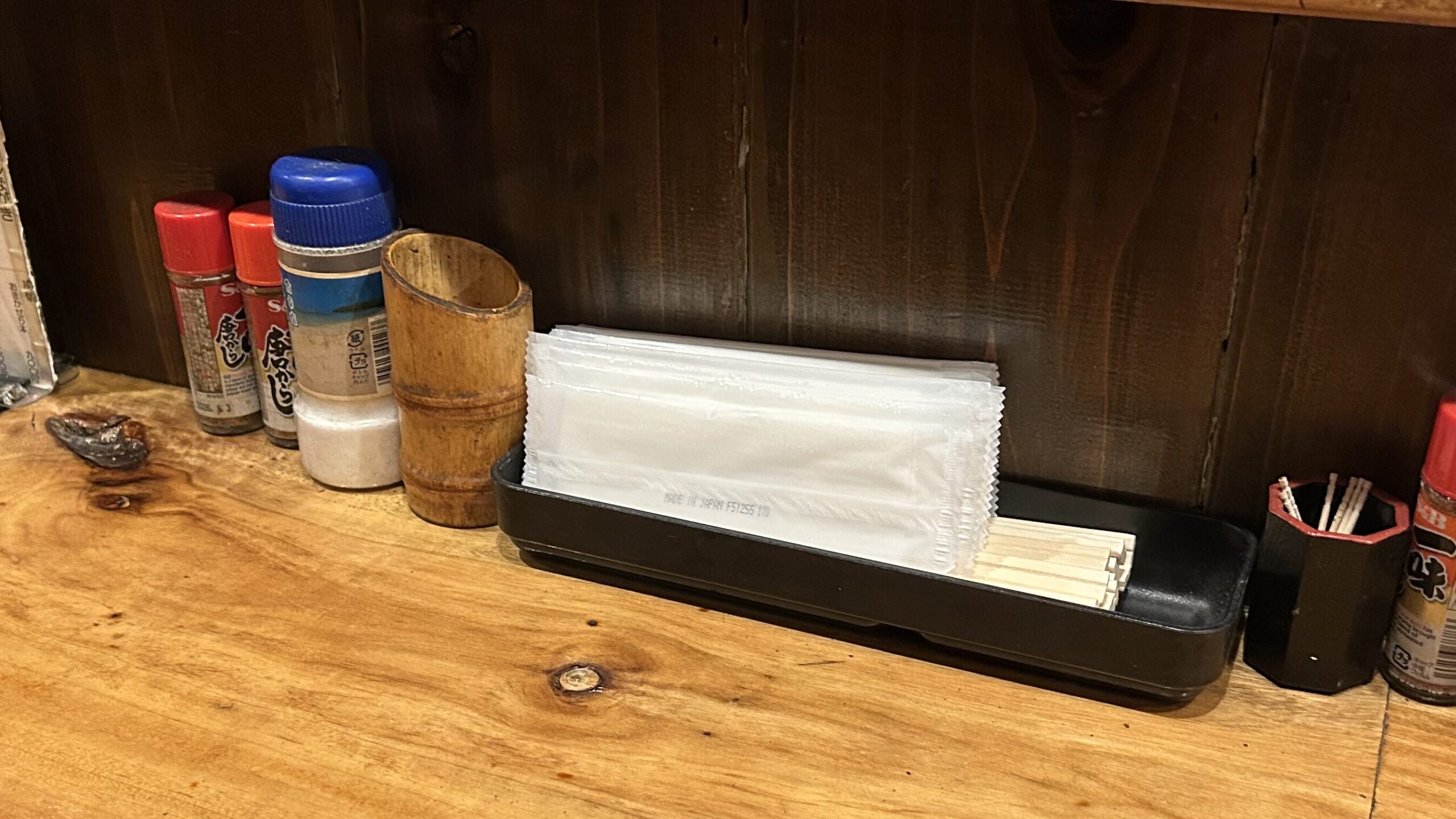 焼き鳥用の調味料としておかれているようです。そのほか、つまようじやお手拭き、割り箸もカウンター沿いに置かれております。