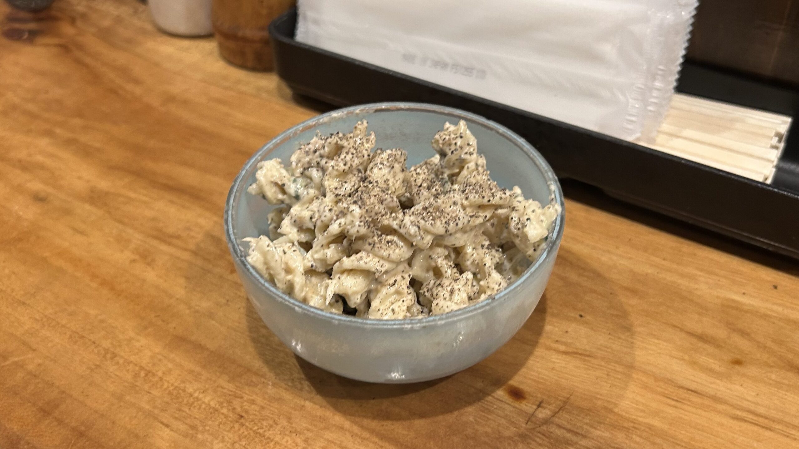 お値段に似合わず結構ボリューミーなのが特徴。シンプルなマヨネーズ味のマカロニサラダにたっぷりと胡椒がかかっており、この呼称がアクセントとなり非常においしくお酒も進む一品となっております。