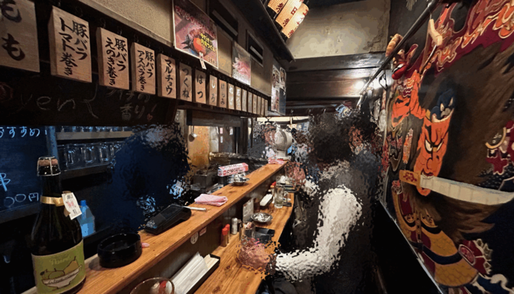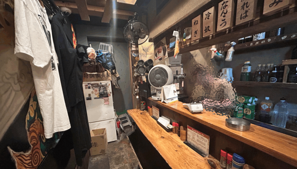 店内から入口方面をむいてとった時の写真です。店内はカウンターのみとなっており、またかなり狭くなっております。入口付近にはテーブルもおかれており、3人以上で行かれた際はテーブルが開いていればそちらをご案内してくれます。