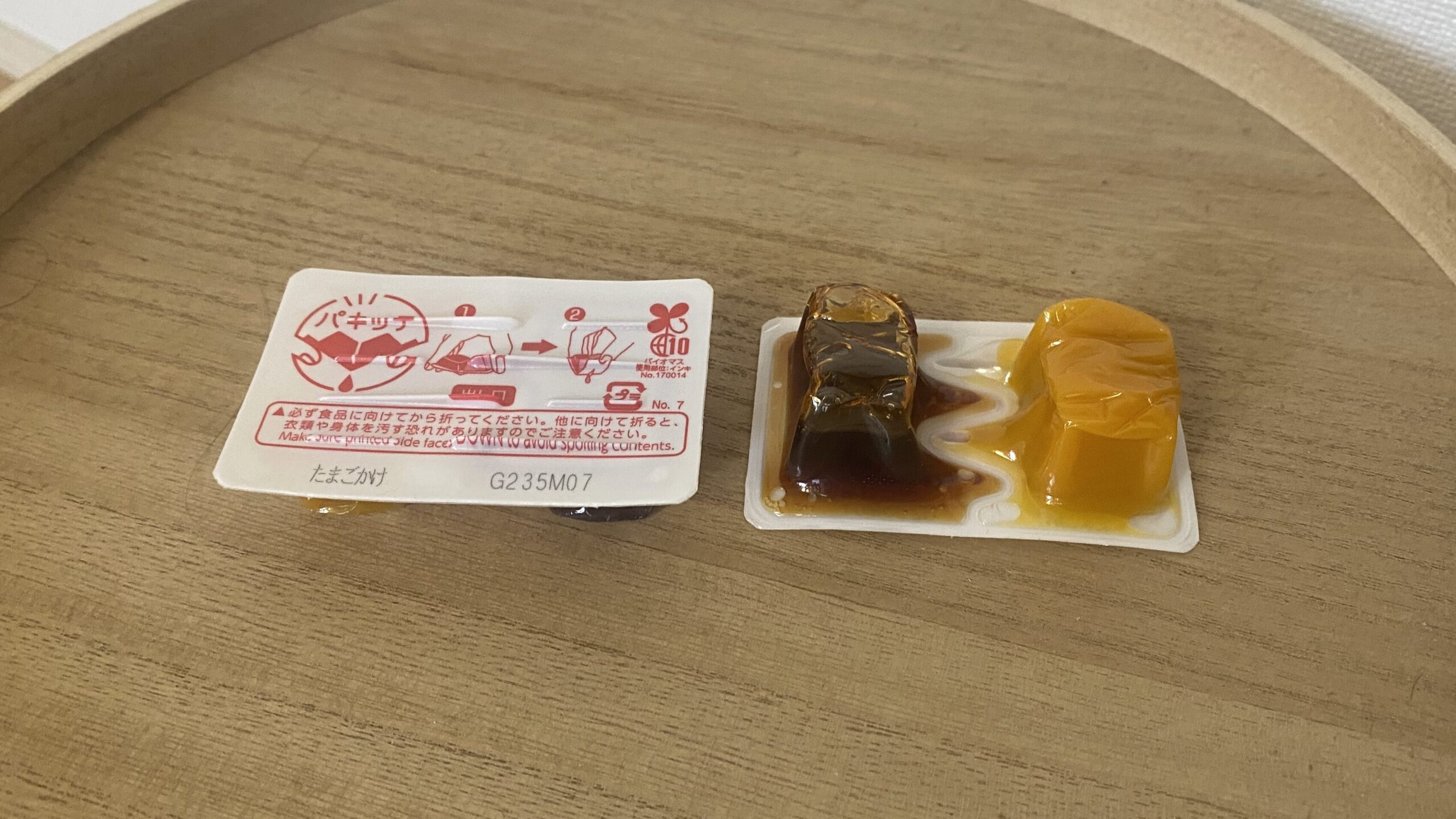小学校時代の給食がパンの日に出てきたマーガリンとジャムが入ったパックのような形であり、それぞれ醤油やその他調味料を含む部分と卵黄ソースが分かれているのが特徴です。