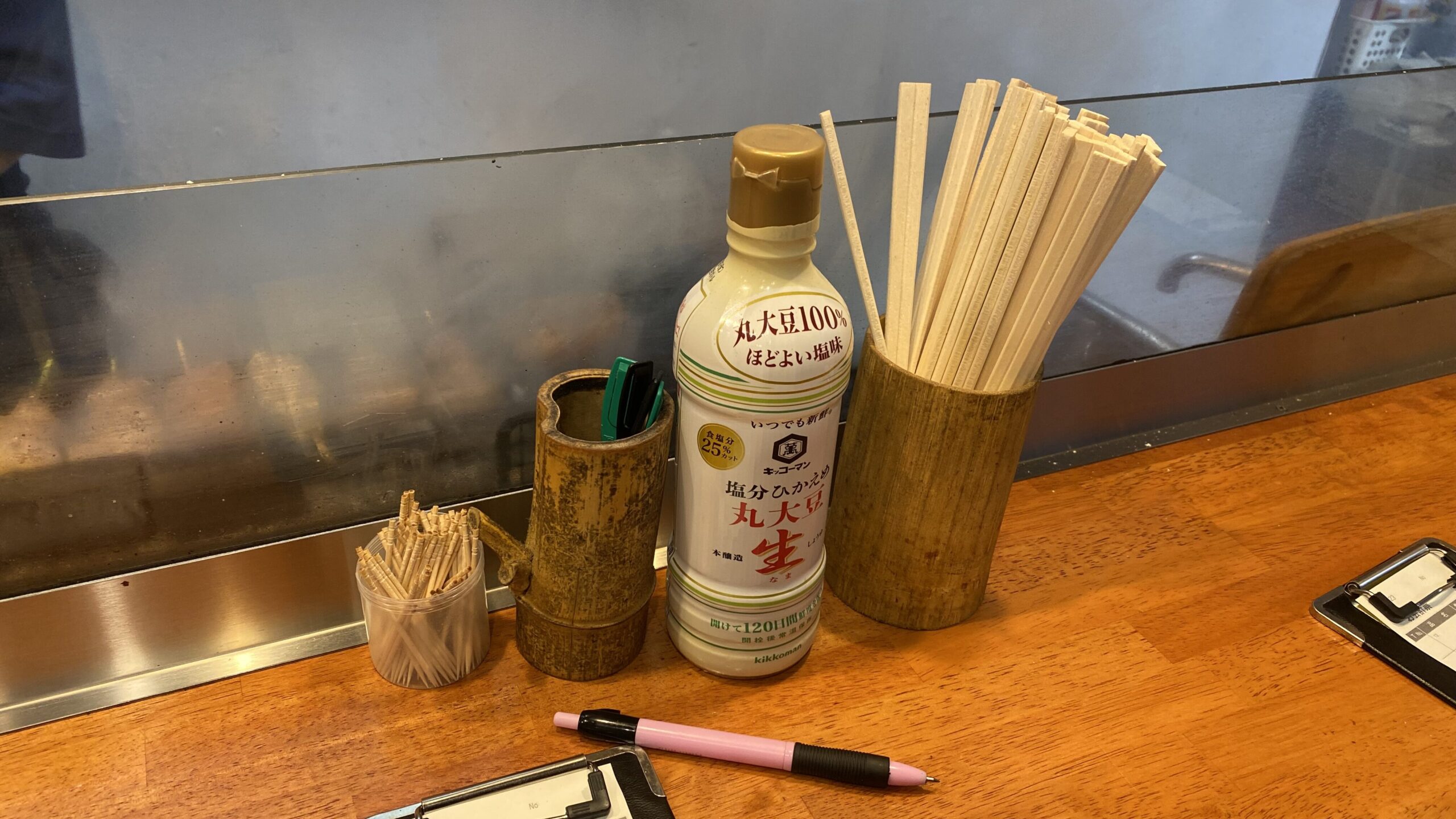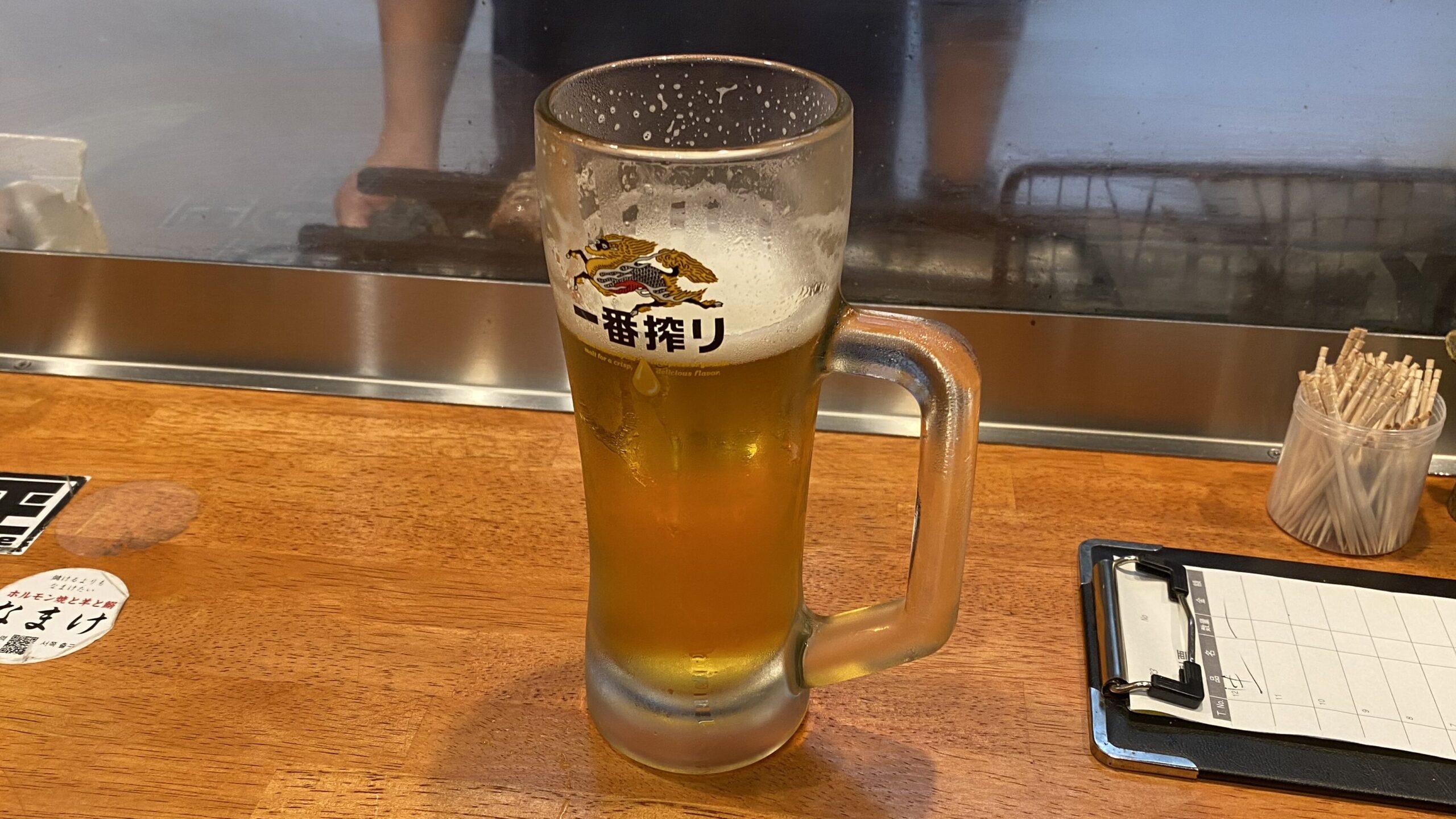 「もつ焼き次郎」は注文が少し特徴的で、テーブルごとに伝票がおかれており、お酒については口頭で注文すると店員が伝票に記入いただけ、おつまみは自分で記載して注文する形になります。