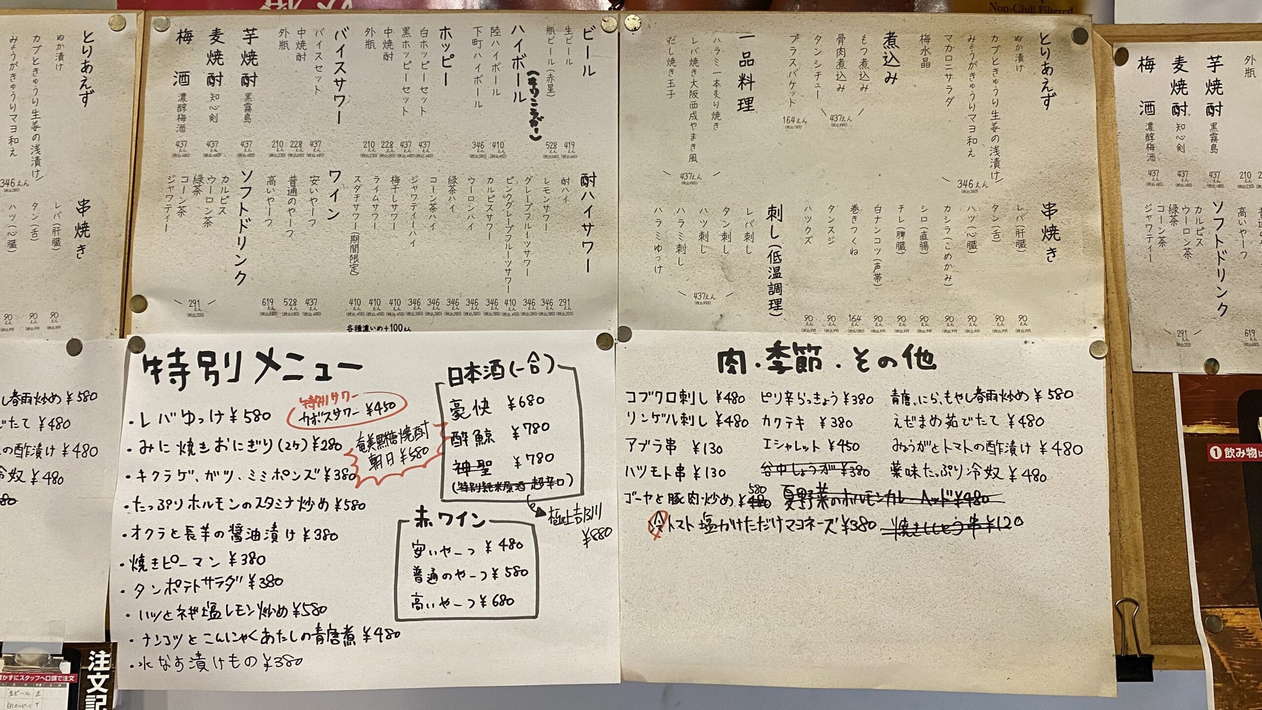 テーブルにメニューはなく店内の壁に貼られております。「おつまみ」「お酒」「特別メニュー」「肉・季節・その他」と4種類のメニューが張られており、お酒もおつまみも種類が豊富でついつい迷ってしまいます。