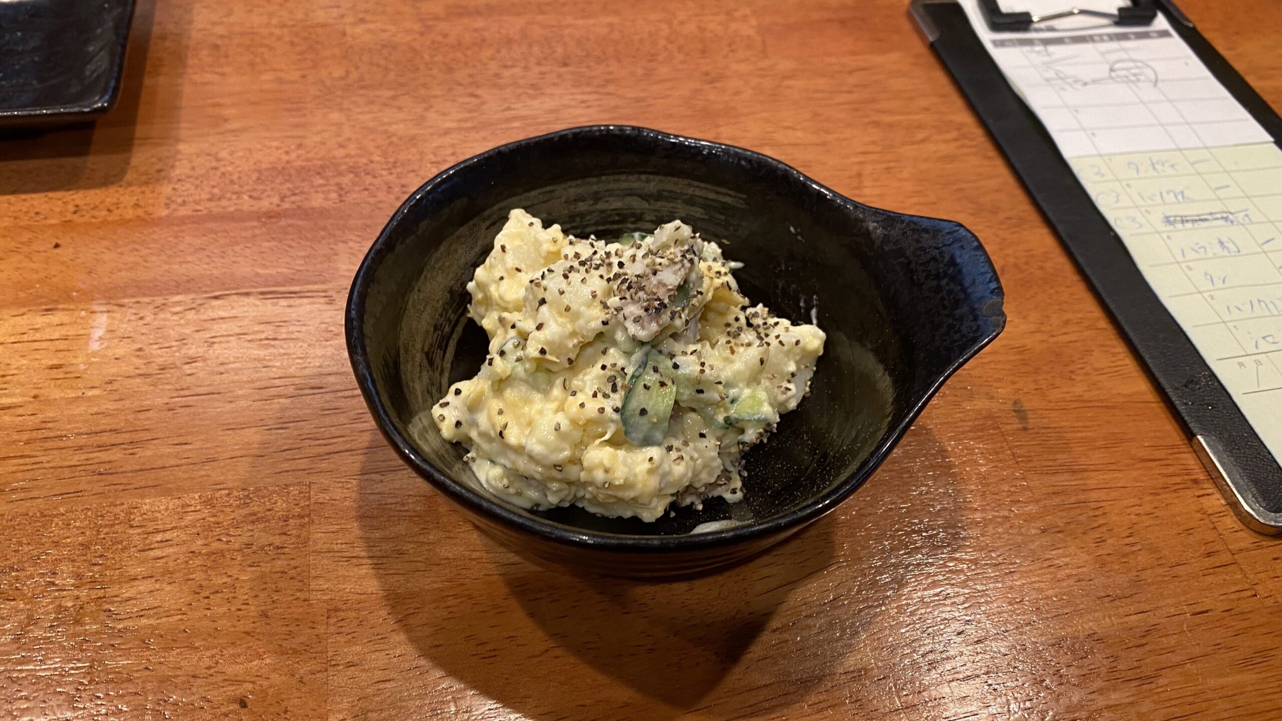 ポテトサラダにタンを混ぜ、上からコショウがかけられております。柔らかなポテトサラダにタンの歯ごたえが加わっている点がポイントです。コショウのスパイシーさもあいまってお酒が進みます。