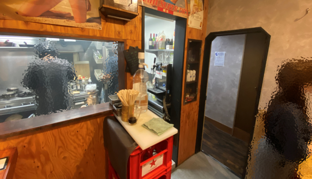 店内奥にはもつ焼き以外の調理場と右手にはテーブル席があります。右手一番奥にはトイレがあります。トイレも非常にきれいです。