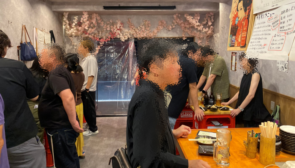店内から入口方面をむいてとった時の写真です。店内手前はビールケースの上に天板がおかれたテーブル席が準備されており、複数人で立ち飲みを楽しめます。