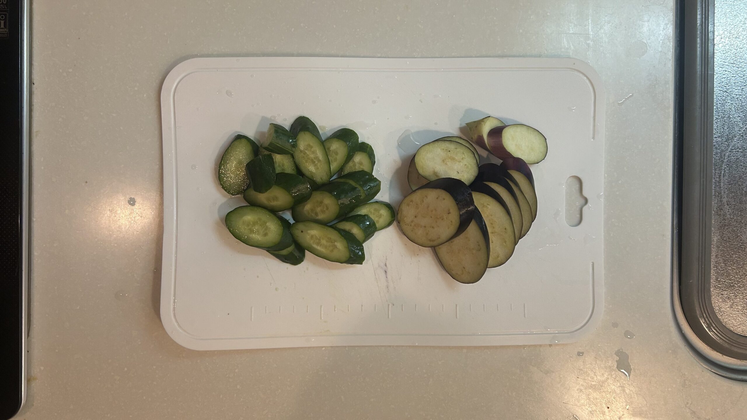 まず、なすときゅうりをカットしていきます。写真のように少し薄めの5mm幅ほどに斜めにカットしていくのがおすすめです。