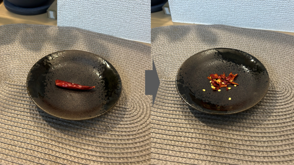 2.お好みで)鷹の爪を細かくちぎる(3分)
