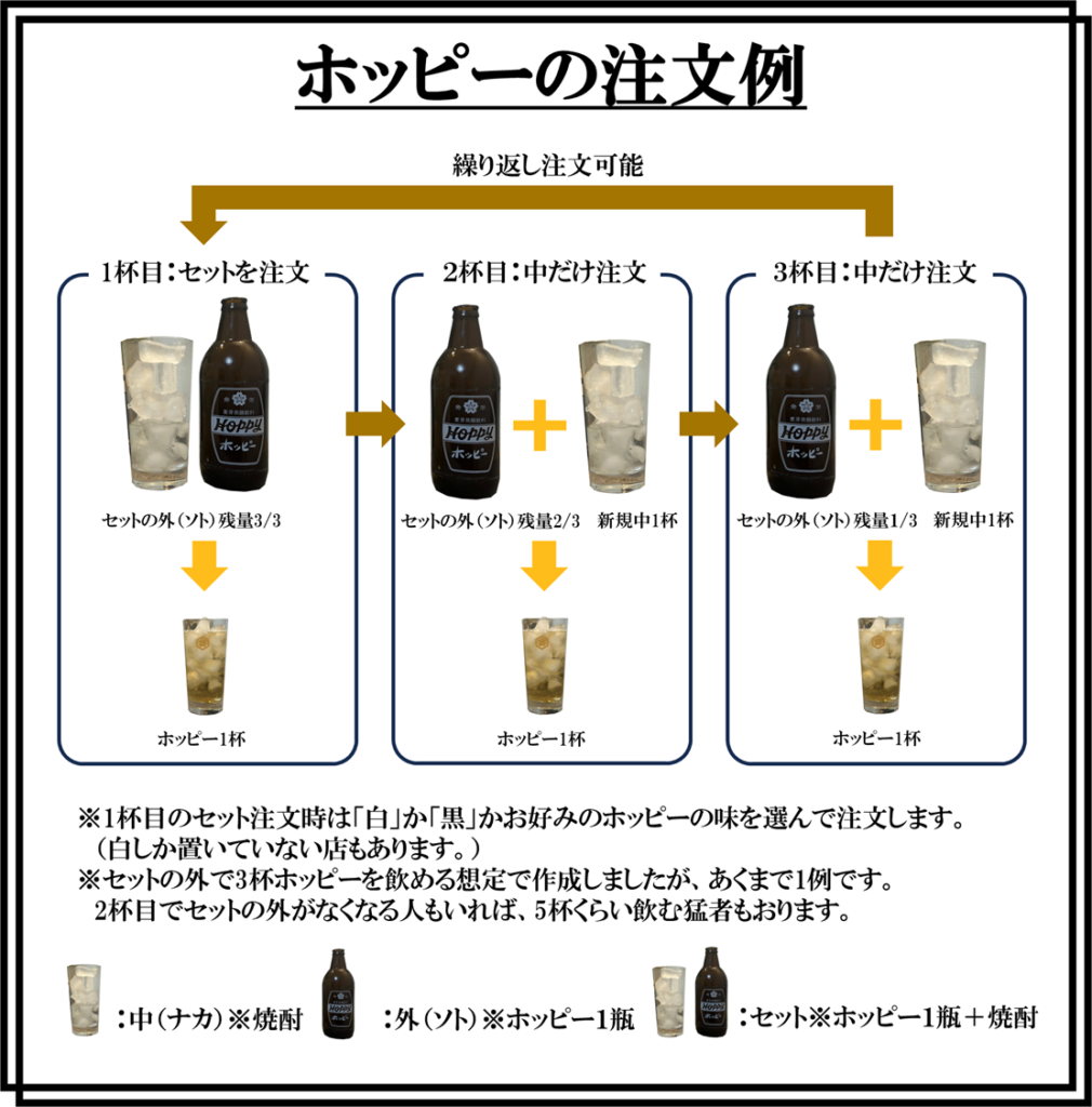 上記図ではセットのホッピー1瓶(外)で3杯飲めるという例を記載しておりますが、2杯目でセットの外がなくなる人もいれば、5杯くらい飲む猛者もおります。