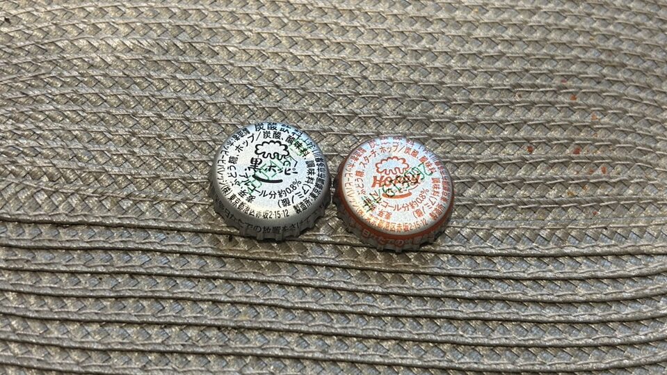 白ホッピーは上記写真の左側のように赤いふたが、黒ホッピーは黒色のふたが使われておりますのでここで見分けることができます。